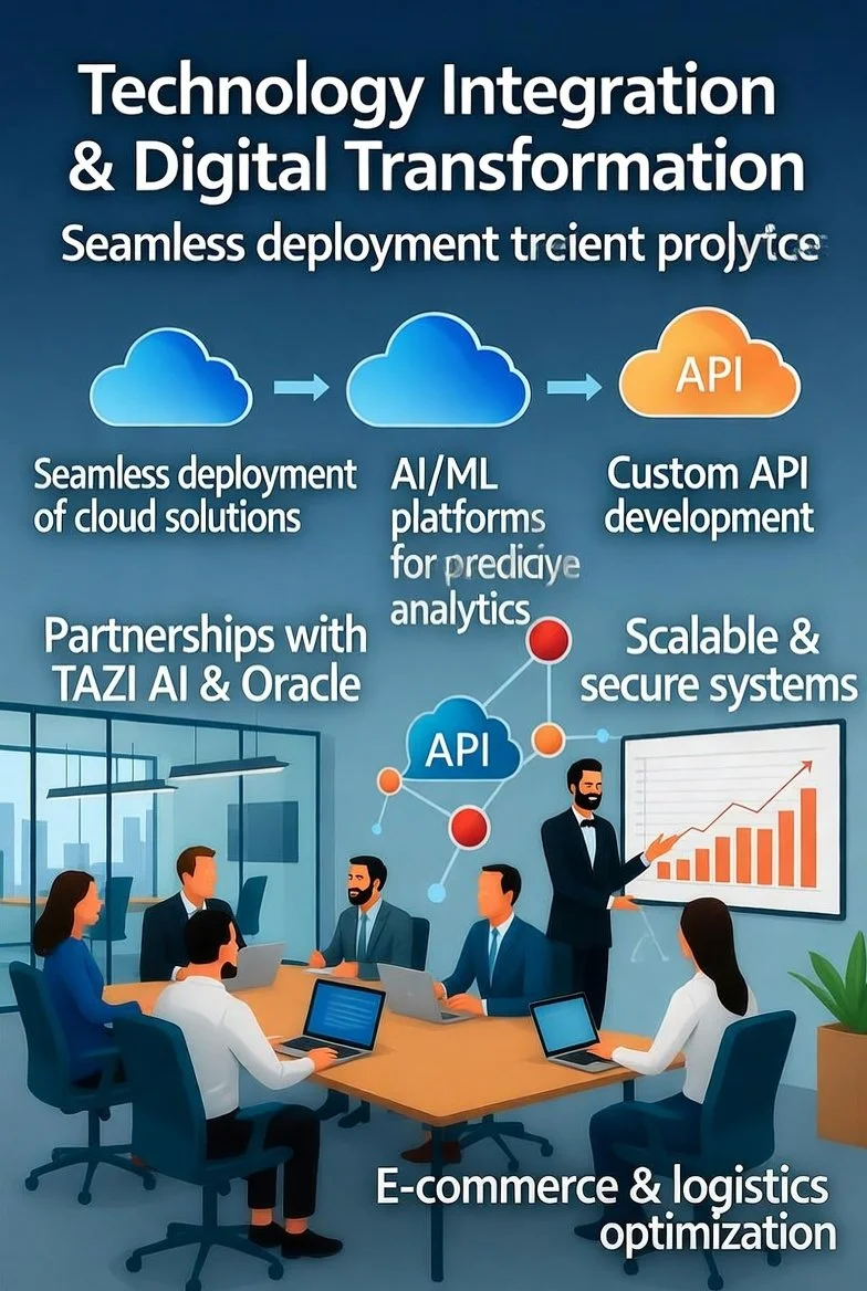 Seamless deployment of cloud solutions, AI/ML platforms, and custom APIs. Our partnerships with TAZI AI and Oracle ensure scalable, secure systems for e-commerce and logistics.